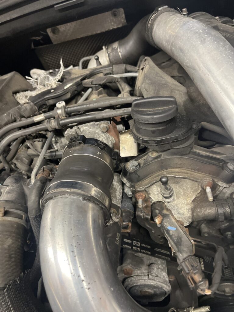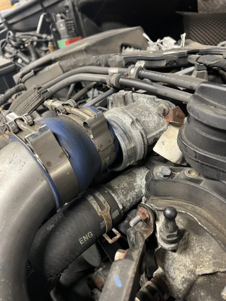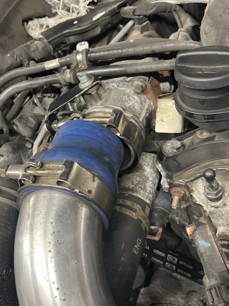 There are lots of terribly designed components out there, and I don’t want to play the blame game. This isn’t 100% Chrysler’s (/Mercedes’) fault, nor the CXRACING aftermarket intercooler kit. This junction is designed for a specific type of connector, which makes it hard to work with. But! It’s been trouble-free since 2021 with the silicone + turbo clamp setup. Obviously, not anymore.