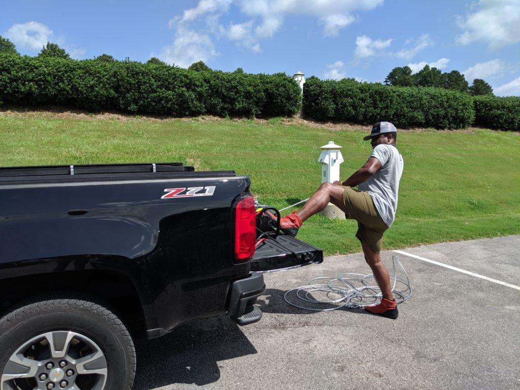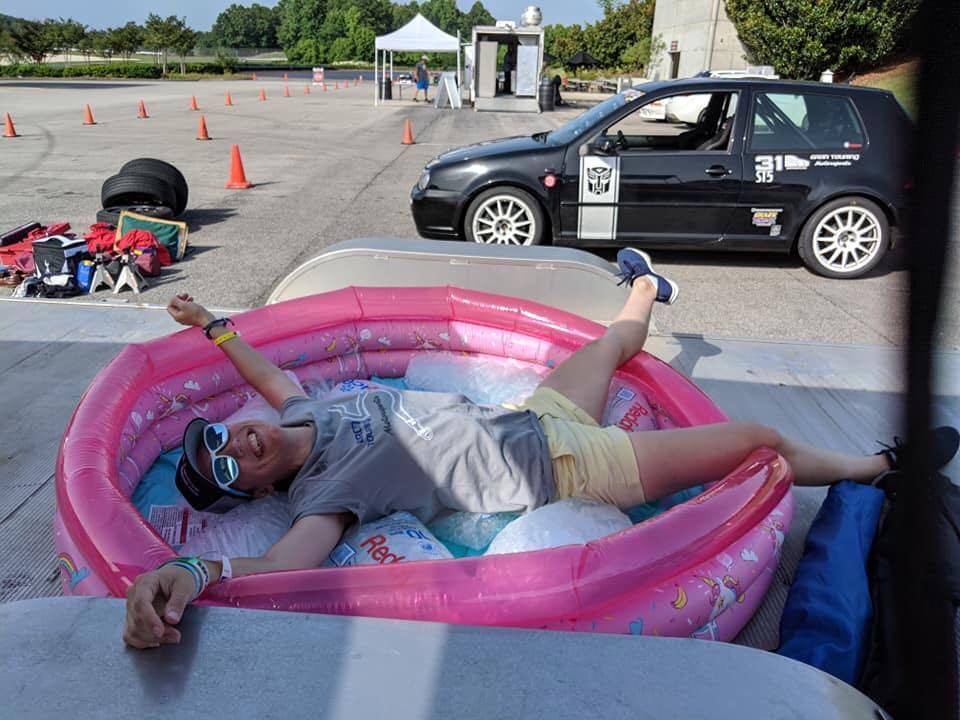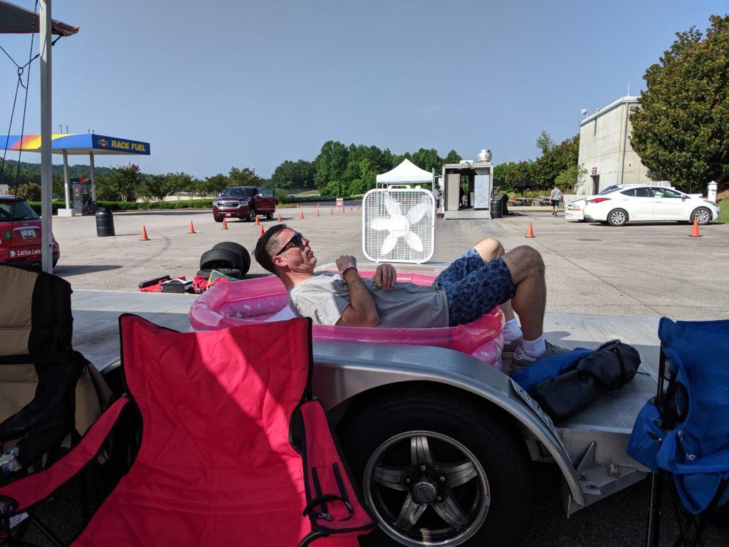 Alabama, in July… I doubt I have to explain much more than that. Chrissy C got creative and setup a kiddy-pool with ice bags and a fan to give us the illusion of a cool breeze. It worked… until it just became a pool. LOL.