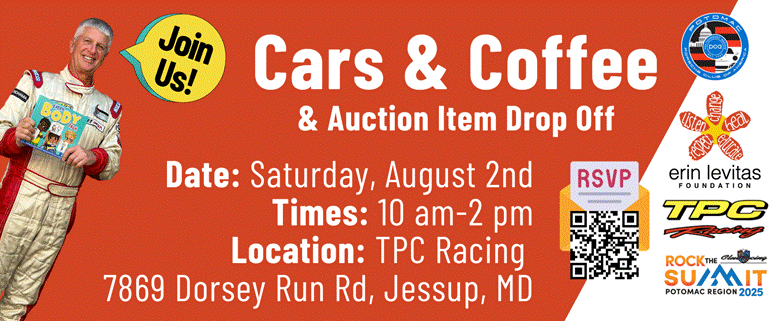 On Saturday, August 2, we will co-host a Cars & Coffee at TPC’s amazing facility in Jessup, MD. Start looking around your house to see what you want to donate to this year’s Erin Levitas Foundation Auction and then bring those items to the event. The auction is the foundation of our September fundraiser each year which raises $60K+ to support the oh-so important sexual assault prevention work of the foundation. It is through the generous item donations of our community that we are able to do that. Contact pat@pcapotomac.org for more info. RSVP here: https://forms.gle/