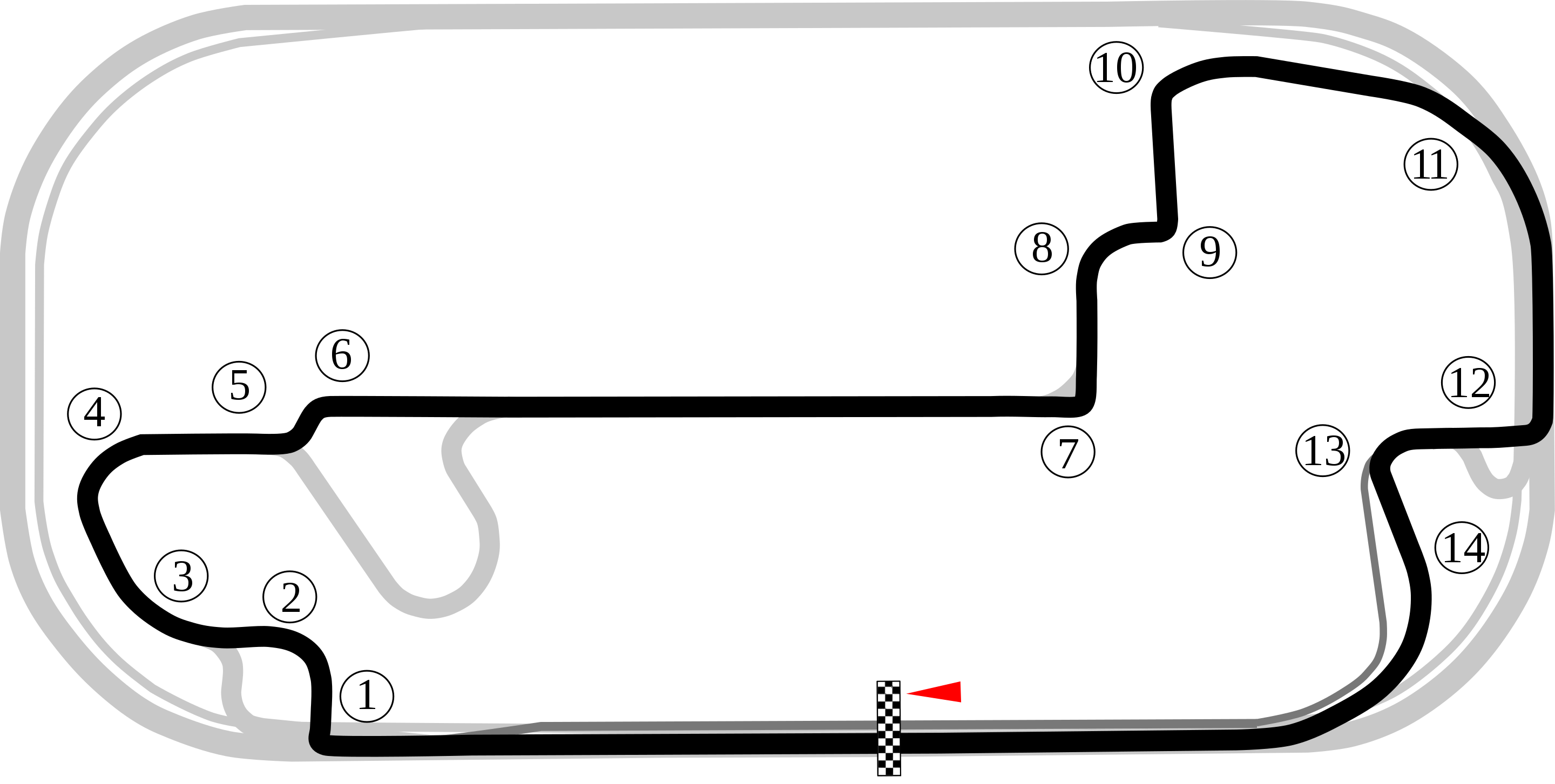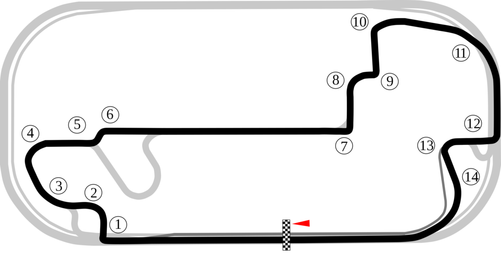 Because IndyGP is rarely open to the public, this event was 3 days long. And since the course is so long (~2.7 miles including the greyed-out section between 5-6 – above right), PCA registered 308 cars! Even with that many cars, we got 3 or 4 sessions per day on the F1 track.