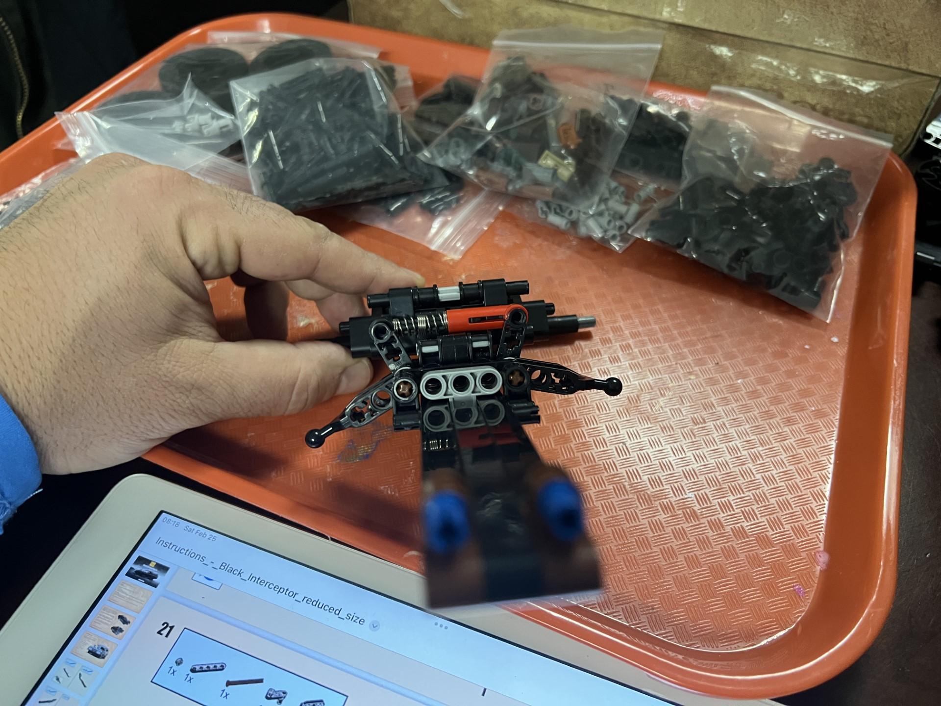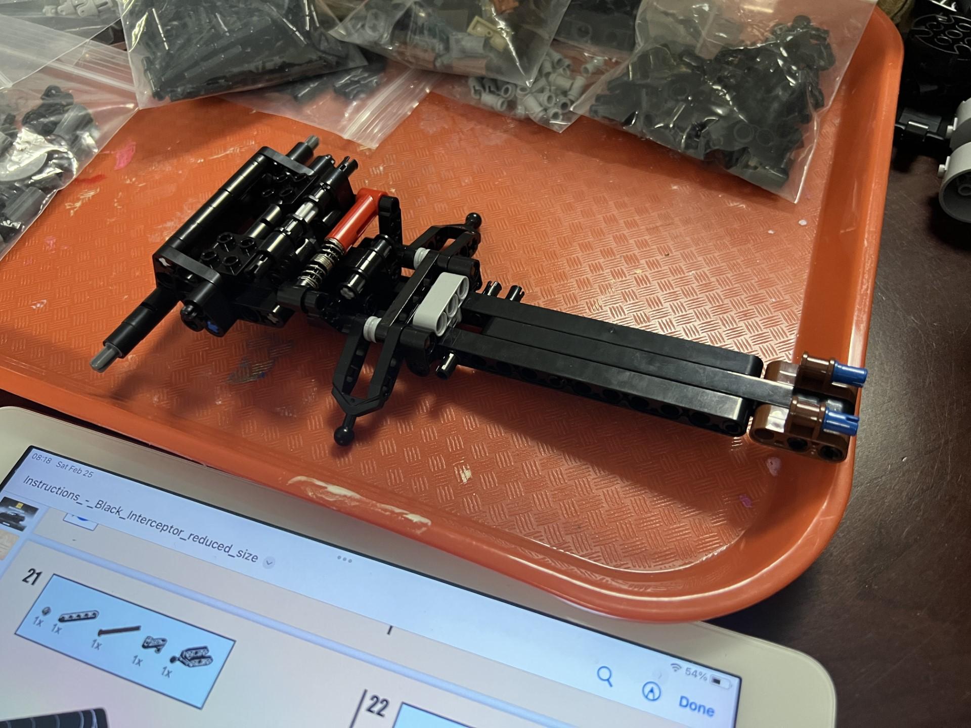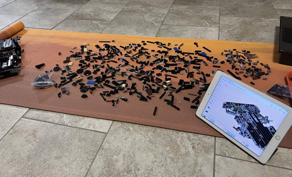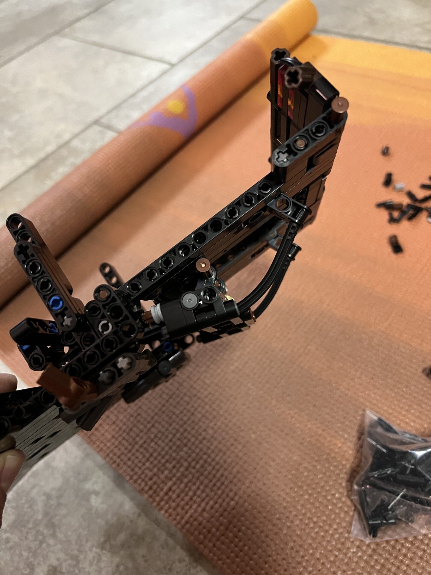 This meant searching from bag to bag in a superbly inefficient manner. Eventually I got fed up, and realizing I was building on a dark table with mostly black parts, I needed more contrast (and space). The best solution, albeit not for my hips, was to sit on the cold, hard, tile floor, and spread all the pieces out on a brightly colored yoga mat. The orange of the mat made the pieces really pop but frustrating to find. My youngest daughter watched me pouring out bags and spreading things apart looking for a piece here or there, trying to make sense of what didn’t seem like anything that would ever amount to an 18″ long vehicle. I still think something is missing. There must be more bags. My daughter in a moment of clearer reasoning than I was willing to put forth said, “Dad… why don’t I help you organize all these pieces into smaller piles of the same parts then you can quickly pull from your inventory.” Good thinking, kid!